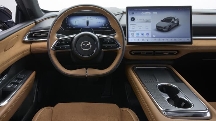 עיצוב ותא נוסעים: כן היא נראית כמו מאזדה כשמביטים בה מקרוב. עם החרטום המוכר שכולל מכסה קדמי ארוך, הפעם עם סבכה גדולה מדומה ופס תאורה עדכני, סמל קדמי מואר ופנסים ראשיים צרים. הפרופיל מזכיר מעין קופה-ארבע-דלתות עם ידיות פתיחה נשלפות, חלונות נטולי מסגרת, חלק אחורי משתפל בחדות וספוילר מתרומם חשמלית בקצה דלת תא המטען. וכן, היא אחת המשפחתיות היותר נאות שעלו על הכביש בשנים האחרונות.