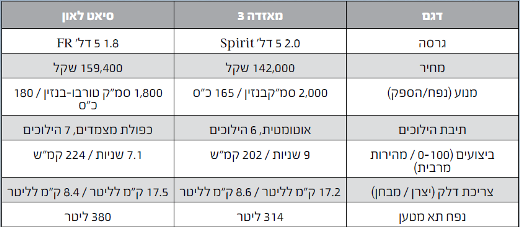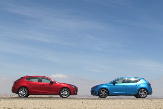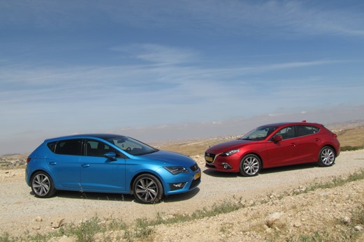 בחרנו לפגוש בשני הקצוות של קבוצת המשפחתיות הללו, בעלות הערך המוסף, במקרה זה - מנועים חזקים ותדמית צעירה-דינמית יותר. מיפן הקפדנית באה מאזדה 3 המגה-פופולרית, שצוידה במנוע בנפח 2.0 ליטר, 165 כ"ס ובמרכב חמש דלתות. מחיר הבסיס שלה הוא 133 אלף שקלים, אבל אל המבחן היא הגיעה ברמת האבזור ספיריט, שמעתירה אינספור תוספות, וגם מרימה את המחיר ב-9,000 שקלים. המכונית שמולה היא סיאט לאון FR שבאה מספרד חמת המזג. הלאון מגיעה עם מערכת כוח מרשימה - מנוע טורבו בנזין בנפח 1.8 ליטר שמייצר 180 כ"ס ומופעל בידי תיבת הילוכים אוטומטית-רובוטית כפולת מצמדים. מחירה של הלאון נמצא בצד השני של הקבוצה - כ-159 אלף שקלים.