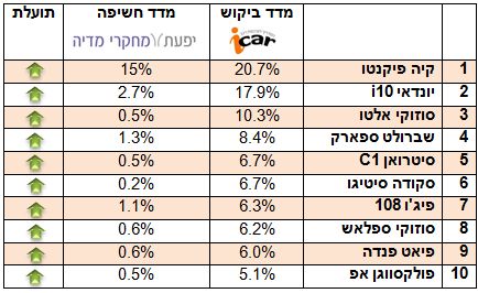 מתאר את חיפושי המכוניות באתר iCar בחודש החולף, באחוזים לכל קטגוריה. הנתון חושב לאחר ניתוח של מיליוני דפים נצפים. בניגוד לטבלת המכירות, שמושפעת באופן משמעותי גם מעוצמתן של רכישות ציי הרכב, החיפוש באינטרנט מתייחס בדרך כלל לרכב שהלקוח מעוניין בו - גם אם לפעמים הוא יקנה מכונית שונה בעקבות מבצע אטרקטיבי או עסקת ליסינג. זו הסיבה לעוצמתם של רכבי "השוק הפרטי" כמו סיאט איביזה, טויוטה יאריס והונדה סיוויק, למשל, לעומת רכבים אחרים שאולי נמכרים יותר, אך ככל הנראה מושפעים פחות מפרסום ויותר מחשיפה וסיקור תקשורתיים.