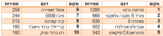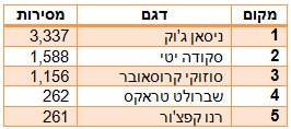 השנה גם זכינו לראות לא מעט השקות מעניינות של דגמים חשובים כמו מאזדה 3, טויוטה קורולה, סוזוקי קרוסאובר ועוד. חלקם כבר השפיע באופן משמעותי על נתוני המכירות, אך רובם יתבלטו בשנה הקרובה. אפשר עוד להמשיך ולנתח את השנה שחלפה, אבל בשלב זה עדיף לתת לטבלאות לדבר בעד עצמן.