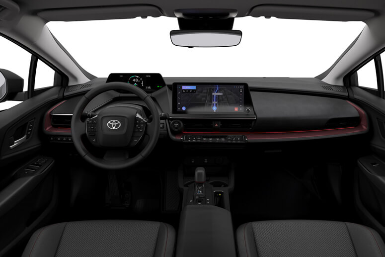 סביבת הנהג של הפריוס החדשה מזכירה את זו של ה-BZ4X החשמלי, עם לוח מחוונים דיגיטלי קטן ("7) שממוקם מעל גלגל ההגה, ומסך מולטימדיה גדול ששוכן מעל לפקדי המיזוג הפיזיים. צבעי הפנים יהיו שחורים בלבד, אך תאורת אווירה צבעונית תשבור את הגוונים הכהים ותאפשר גם מתן התרעות של מערכות הבטיחות, שלב אחד לפני ההתרעות הקוליות.