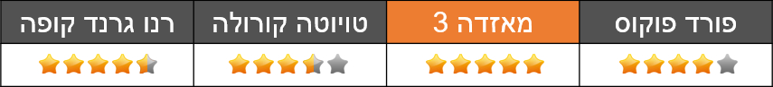 בין המאזדה והפורד התחולל קרב צמוד. שתיהן איכותיות מאוד, מלוטשות ומהנות לנהיגה; המאזדה פונה יותר לנהג ומציגה עיצוב פנים מעולמות היוקרה, תא נוסעים איכותי ומאובזר, הנדסת אנוש מצוינת והתנהגות כביש מהנה מאוד. היא גם נוחה יותר מדגמי העבר של ה-3 ונהנית מהביצועים הטובים ביותר במבחן.