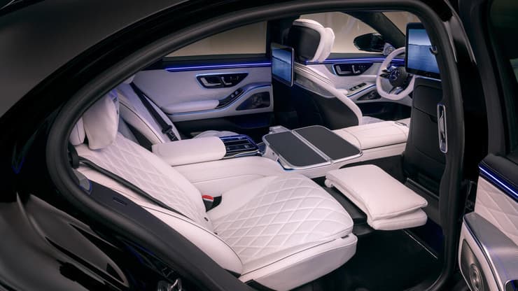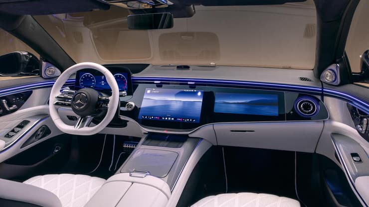 בתא הנוסעים יש מסך מגע מרכזי גדול מבעבר ("14.4 לעומת "12.8) ומסך נוסף לנוסע ("12.3) המאפשר לשחק, לצפות בסרטים ולהפעיל מגוון יישומים. לוח המחוונים הדיגיטלי נותר ללא שינוי ("12.3) עם אופציה לתצוגה תלת-ממדית, בעוד לנוסעים מאחור יהיו שני מסכים בגודל "13.1 עם שלט נפרד לכל אחד ואפשרות לשיחות וידאו (בזום למשל).