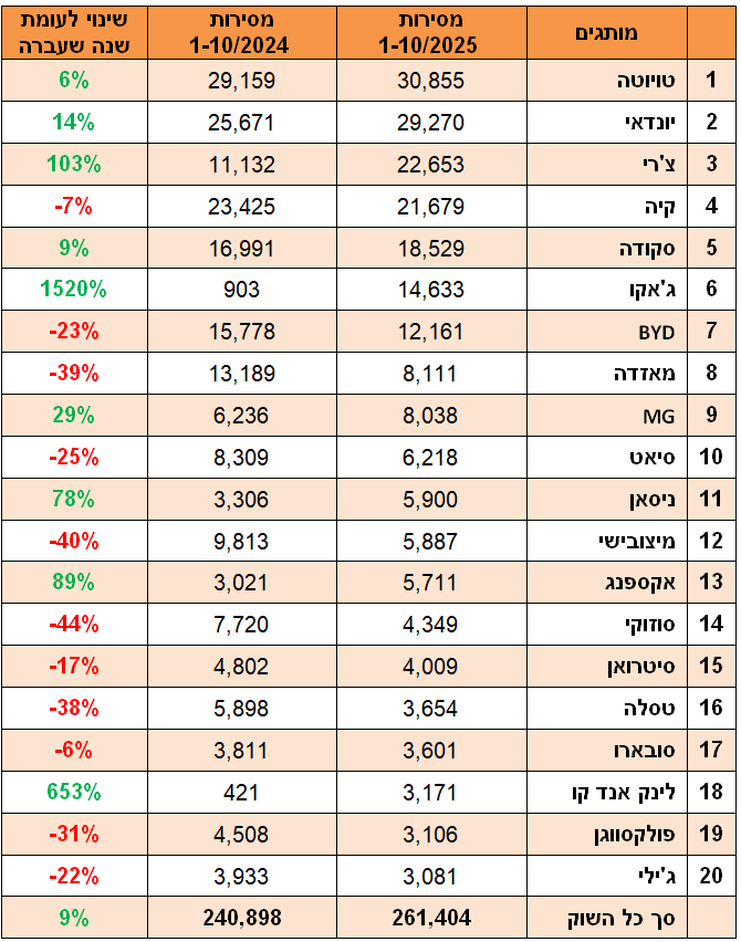 החשמל עוד פה: למרות שנתח השוק של המכוניות החשמליות רשם ירידה משמעותית בתחילת השנה, בחודשים האחרונים הוא חוזר לטפס - וכעת מתייצב על 20%, עליה של 4% לעומת התקופה המקבילה אשתקד. מותג החשמליות המוביל הוא BYD עם קרוב ל-8,000 מסירות, ואחריו צ'רי (6,200), אקספנג (5,700) וטסלה (3,700).