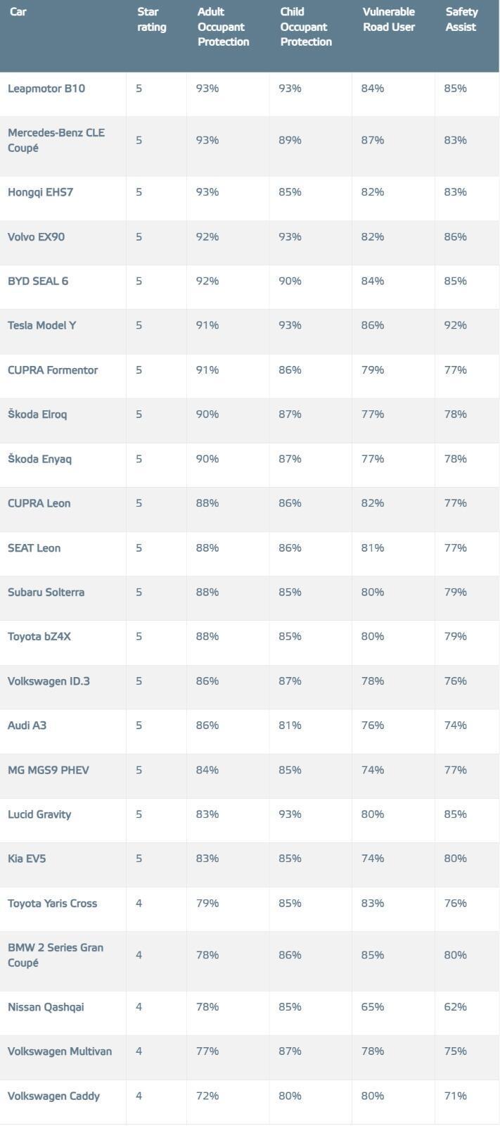וולוו EX90, רכב פנאי חשמלי גדול, זכה לציון מכובד בהגנה על מבוגרים (92%) לצד 93% בהגנה על ילדים. הסיל 6 של BYD, מודל Y של טסלה, קופרה פורמנטור ואלרוק ואניאק של סקודה, זכו גם הם לציון של 90% ומעלה במבחני הריסוק בהגנה על מבוגרים. טסלה השיגה 93% גם בהגנה על ילדים.