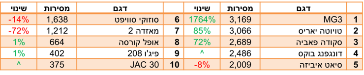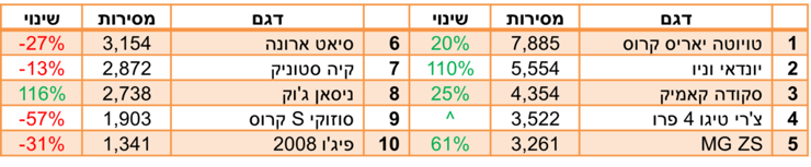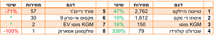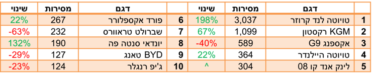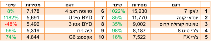 הדור החדש של טויוטה לנדקרוזר רשם שנת בכורה היסטרית, עם היקפי מכירות כמעט לא הגיוניים לרכב שעולה יותר מ-400 אלף שקל. הרקסטון הוותיק שבמקום השני רשם אף הוא עליה נאה, ובהמשך הטבלה ניתן לפגוש את הנציגים החדשים שהגיעו מסין עם הנעה היברידית-נטענת, וצפויים לכבוש את הצמרת בשנה הבאה: לינק אנד קו שהתברג כבר בעשירייה, וג'אקו 8 וצ'רי טיגו 9 שיעשו זאת כנראה בהמשך.