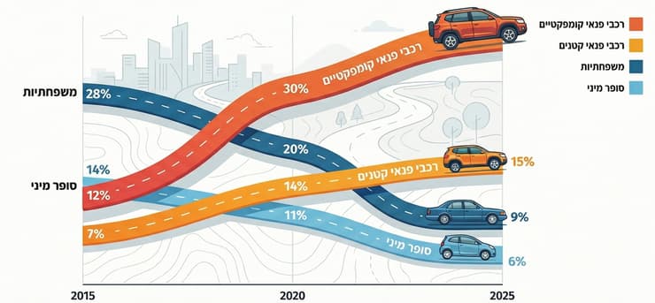 רק לפני עשור, בשנת 2015, המכוניות הפופולריות ביותר בשוק היו המשפחתיות עם נתח שוק של 28%, ולצידן המשפחתיות הקטנות (יונדאי אקסנט וחברותיהן) שתפסו עוד 8% - בסך הכל יותר משליש משוק הרכב החדש. 10 שנים מאוחר יותר מחזיקות שתי הקטגוריות יחדיו נתח של 9% בלבד. זאת בעוד רכבי הפנאי הקומקפטיים חולשים על 50% מהשוק, ויחד עם יתר קטגוריות הפנאי - הקטנים, הגדולים והיוקרתיים - מציגים שליטה בלתי מעורערת של עדרי SUV על כבישי ישראל, עם נתח של 71%. נוק אאוט.