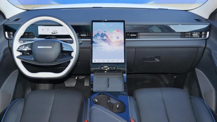 סביבת הנהג משלבת לוח מחוונים דיגיטלי צר ("8.8) ומסך אנכי גדול ("13.2) האחראי על תפעול מרבית המערכות. איכות החומרים אינה אחידה, ולצד דיפון נאה דמוי עור יש פלסטיקה שחורה פשוטה מדי וקודרת. לשמחתנו, ובשונה מהמקובל בחשמליות סיניות רבות, נמנעו כאן מהתחכמות מיותרת ושמרו על מתגים סטנדרטיים לפתיחת חלונות וכיוון מראות, כיוון ידני לפתחי המיזוג וכיסוי בד אוטם לגג הזכוכית הגדול.