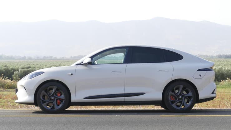 כמקובל, ידיות הדלתות נפתחות חשמלית והשמשות נטולות מסגרת ומאפשרות מקדם גרר נמוך יחסית (0.24), גם אם לא שובר שיאים. לרכב המבחן יש חישוקים גדולים ("21) שאינם מסייעים לטווח הנסיעה, ועיצובם חושף אותם לשריטות. ואם כבר, על צבע כתום לקאליפר אפשר היה לוותר.